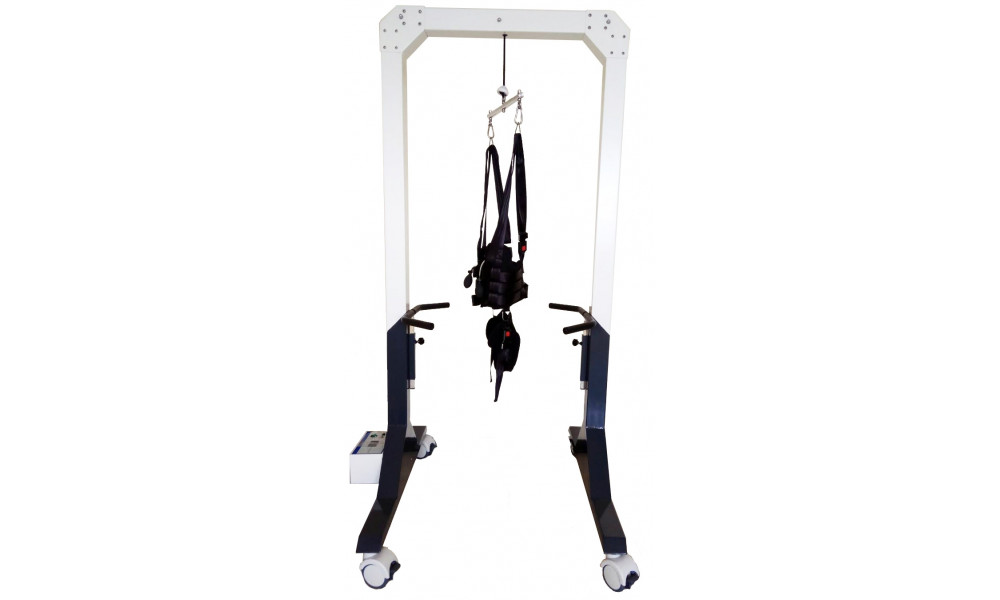 - Подвес оснащен электроприводом для разгрузки веса пациента. С его помощью на ноги и позвоночник тренирующегося можно снизить или полностью избавить от тяжести собственного веса.